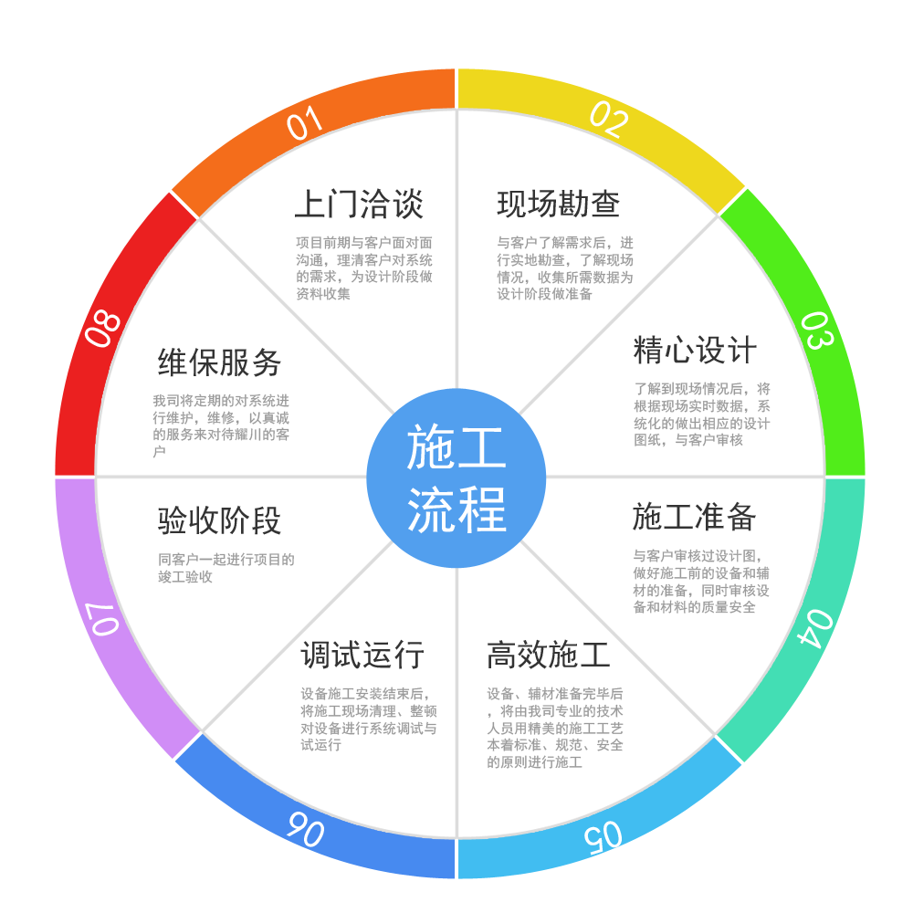 公司拥有一套完善的弱电施工和售后服务体系,对于客户遇到的一些问题,我们都会派遣专业的维护人员上门维护。整个过程拥有一套详细的服务体系,这是我们公司的根本。长远的发展才是我们一直奋斗的目标,用我们的努力为客户创造价值。在客户满意的前提下,我们还不断的提升自我能力,寻求新的突破。